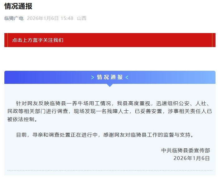 1号配资 山西临猗通报“养牛场用工情况”:发现一名残障人士,已妥善安置,涉事相关责任人已被依法控制 1号配资 来源:中融证券平台 网站:广盛网app 日期:2026-01-07 06:25:15 查看:84